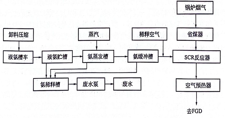 脫硝后煙氣經空氣預熱器熱回收后進入靜電除塵器。然后經FGD裝置脫硫排放。每臺鍋爐配設一套scr反應器,每兩臺鍋爐共用一套液氨貯存和供應系統。