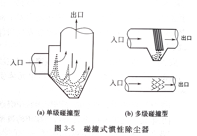 利用粉塵與氣體在運動中的慣性力不同,使粉塵從氣流中分離出來。在實際應用中實現慣性分離的一般方法是使含塵氣流沖擊在擋板上,使氣流方向發(fā)生急劇改變,氣流中的塵粒慣性較大,不能隨氣流急劇轉彎,便從氣流中分離出來。在慣性除塵方法中,除利用了粒子在運動中的慣性較大外,還利用了粒子的重力和離心力。