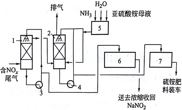 (1)1-堿液吸收塔;2-亞硫酸銨吸收塔;3-堿泵;4-亞硫酸銨泵 ; 5-亞硫酸銨液貯槽;6-亞硝酸鈉溶液貯槽;7一硫銨成品槽。